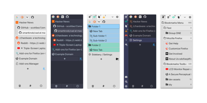 Sidebery is a highly configurable sidebar Firefox extension for managing tabs and bookmarks. It allows vertical tabs panels, bookmarks panels, history panel, search in panels, customizable context menu, customizable styles, and more.
