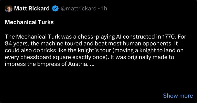 The Mechanical Turk was a chess-playing AI constructed in 1770 that cleverly concealed a human operator inside. In 2005, Amazon launched its own version of the Mechanical Turk called Amazon Mechanical Turk.