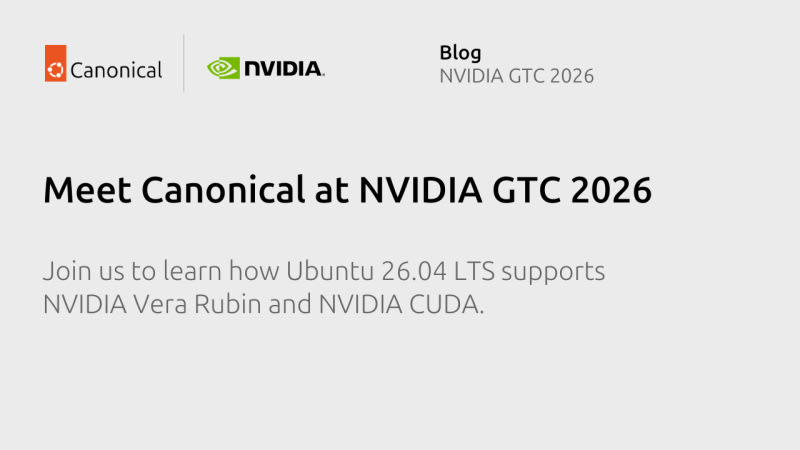 Sneak peek: what you can expect at the Canonical booth this yearCUDA support in Ubuntu 26.04 LTSVera Rubin NVL72 architecture support in Ubuntu 26.04Official Ubuntu 24.04 LTS image for NVIDIA Jetson ThorDeploying AI with NVIDIA Nemotron inference snaps on NVIDIA DGX SparkDiscover Canonical’s latest hardware enablementsAbout CanonicalLearn moreSort:
