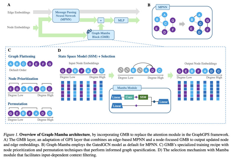 Graph-Mamba is an innovative graph model that integrates a selective SSM into the GraphGPS framework, achieving advanced sparsification and promising significant improvements in computational efficiency and scalability. It outperforms sparse attention methods and rivals dense attention Transformers.