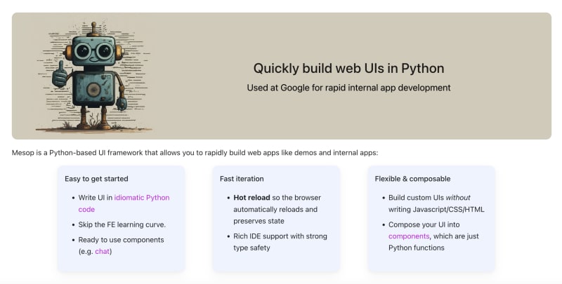 Mesop is a Python-based UI framework that allows developers to quickly build web apps without needing to delve into JavaScript, CSS, or HTML. It offers features like hot reload, strong type safety, and ready-to-use components, making web development more accessible and efficient.