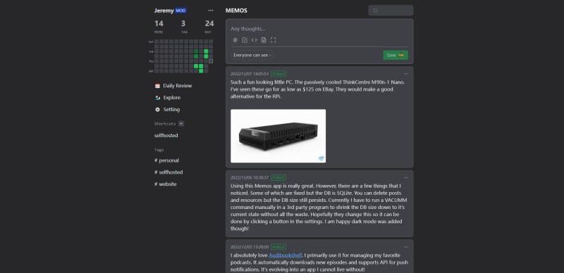 Memos is an open-source, self-hosted memo hub with knowledge management and socialization. It gives you the feeling of a social hub while you can make it as private or public as you want. It loads fast and just works as intended. Hashtags let you better organize your Memos notes into categories.