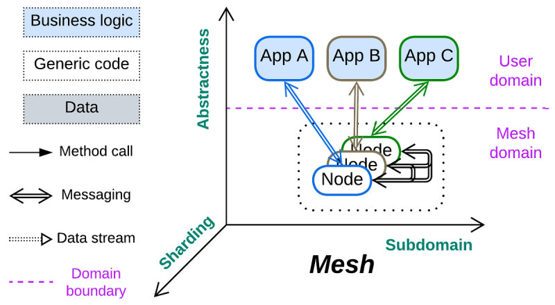 Mesh is an architectural pattern that uses interconnected, layered shards as middleware, enhancing scalability and fault tolerance in distributed environments. It supports dynamic scaling and high availability but may introduce communication artifacts and performance overhead. Meshes vary significantly by structure, connectivity, and layers, and are implemented in various forms such as Peer-to-Peer Networks, Leaf-Spine Architecture, Actors, and Service Meshes.