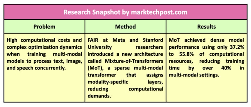 Meta AI researchers, in collaboration with Stanford University, have introduced Mixture-of-Transformers (MoT), a novel sparse multi-modal transformer architecture designed to significantly reduce pretraining computational costs. MoT incorporates modality-specific parameters, optimizing text, image, and speech processing without