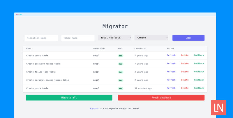 Migrator is a migration manager for Laravel. You can create, migrate, delete, and roll back your migrations. It provides a simple interface powered by Livewire that enables you to see the status of each migration easily. By default, the /migrator UI is locked down via auth middleware.