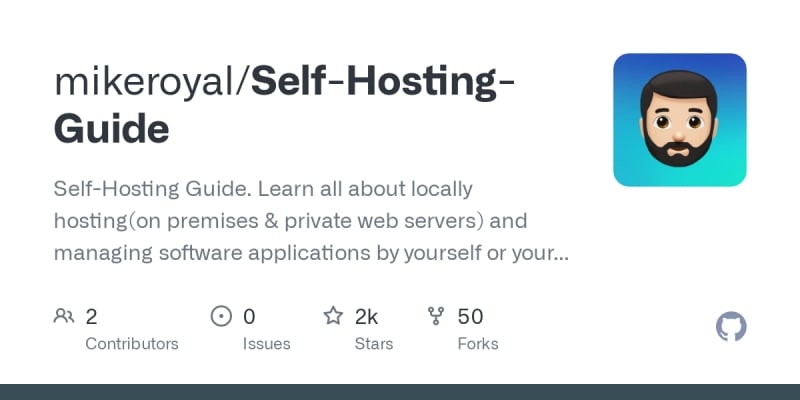 Self Hosting GuideTable of ContentsGetting Started with Self-HostingWireGuardNextcloudRaspberry PiRaspberry Pi UpgradesGrafanaNetworkingDockerKubernetesAnsibleDatabasesTelco 5GOpen Source SecurityDifferential PrivacyMachine LearningIoT ProtocolsOperating systemsMiddlewareNode flow editorsData VisualizationSearchHardwareHome automationRoboticsMesh networksBlockchain DevelopmentNode.js DevelopmentC/C++ DevelopmentJava DevelopmentPython DevelopmentRust DevelopmentSwift DevelopmentXML Development4 Comments
