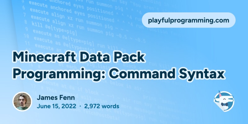 A tutorial on Minecraft Java Edition data pack development focusing on command syntax. Covers the /execute command for conditional logic, position syntax (absolute, tilde/relative, and caret/directional coordinates), entity selectors and their filter attributes, and how to combine these features. Includes practical examples like spawning entities at specific locations, killing entities by type, filtering entities by distance or area, and a challenge to detect when a player is falling using tick functions.
