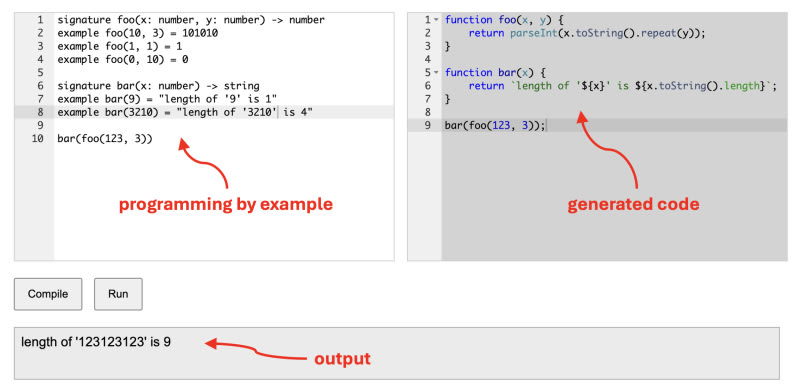 Mirror is a programming language that exclusively uses programming by example, allowing users to define functions through sample input-output pairs. It leverages an LLM to generate JavaScript code that meets the defined constraints. Users can run Mirror in their browser using a provided playground on GitHub and can integrate it