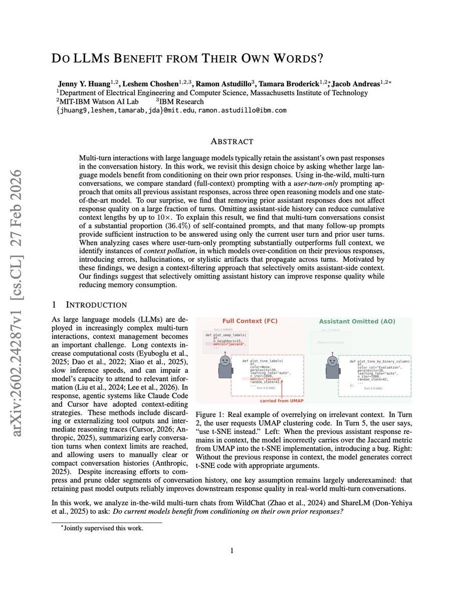 MIT researchers discovered a phenomenon called "context pollution" where llms get WORSE by reading their own prior responses errors, hallucinations, and stylistic artifacts from earlier turns propagate forward because the model treats its own output as ground truth and removing that history fixes it 🤯