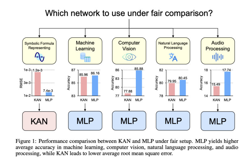 Multi-layer perceptrons (MLPs) and Kolmogorov-Arnold Networks (KANs) were compared across diverse domains, including machine learning, computer vision, and natural language processing. The study found that MLPs generally outperformed KANs in most tasks, particularly in audio and text classification, and computer vision.