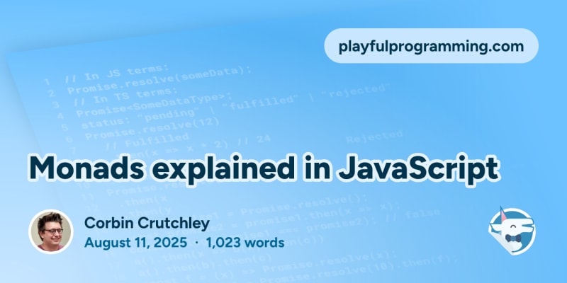 A JavaScript-focused introduction to monads, using Promises as the primary example. Explains the core definition (wrapping data, adding context, chaining through immutable operations) and walks through the three monad laws: the Associative Law, Left Identity, and Right Identity. Each law is illustrated with concrete