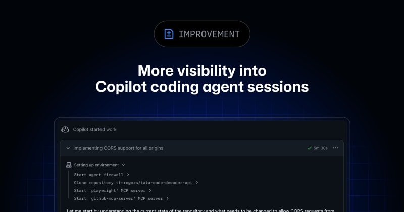 GitHub has improved the session log visibility for Copilot coding agent. Updates include clearer logging for built-in setup steps (repository cloning and agent firewall initialization), output from custom setup steps defined in copilot-setup-steps.yml, and a collapsible heads-up display for subagent activity showing real-time
