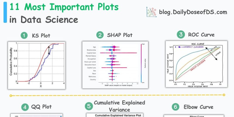 The post discusses the most important plots in data science, including the KS Plot, SHAP Plot, ROC Curve, Precision-Recall Curve, QQ Plot, Cumulative Explained Variance Plot, Elbow Curve, Silhouette Curve, Gini-Impurity and Entropy, Bias-Variance Tradeoff, and Partial Dependency Plots.