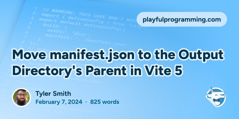 When using Vite 5 with a backend framework like Flask, you may need the manifest.json file placed outside the build output directory to prevent it from being URL-accessible. Vite (via Rollup) does not support relative paths in the manifest config option. Two workarounds are presented: the simple approach of appending a shell `mv` command to the build script in package.json, and a more robust approach of writing a custom Vite plugin that uses the `writeBundle` hook to rename/move the manifest file after the build completes. The plugin approach is more maintainable when output directory or manifest filenames change.