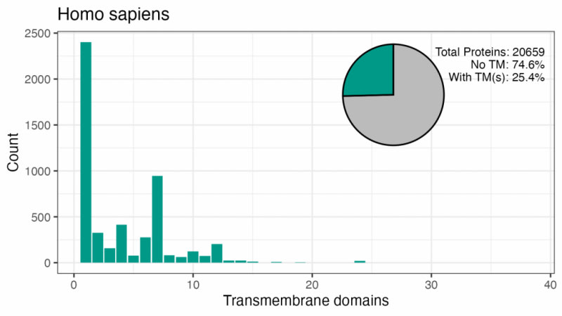 A bioinformatician used R to query the UniProt API and calculate the distribution of transmembrane domains (TMDs) across the human proteome and several model organisms. Key findings: about 25% of the 20,659 human proteins have at least one TMD, with single-TMD proteins being most common (2,402 proteins, ~46% of TMD-containing