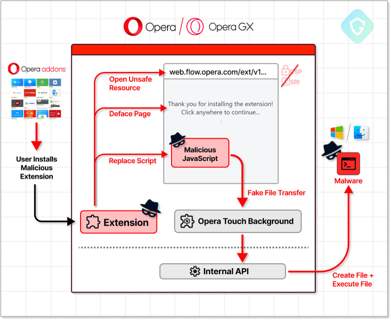 A critical zero-day vulnerability was discovered in Opera's browser that allowed attackers to execute malicious files using a specially crafted browser extension. The vulnerability was found in Opera's My Flow feature, which has the potential for high security risks. The Guardio Labs research team disclosed the issue to Opera and the company responded promptly with a fix.