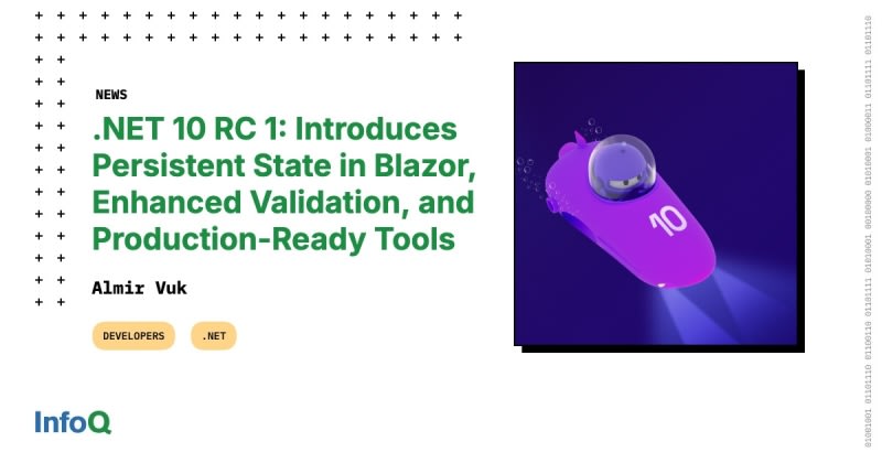 .NET 10 Release Candidate 1 is now available with production support, introducing persistent component state in Blazor for enhanced navigation, improved validation for Minimal APIs and Blazor with new attributes, refined OpenAPI schema generation, and dark mode support for Windows Forms. Entity Framework Core 10 adds SQL Server
