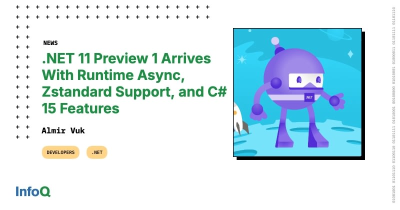 .NET 11 Preview 1 has been released, with Runtime Async as the headline feature — shifting async/await state machine handling from the C# compiler into the runtime itself, enabling first-class async support including Native AOT. Other highlights include native Zstandard compression via ZstandardStream, a BFloat16 type for AI/ML