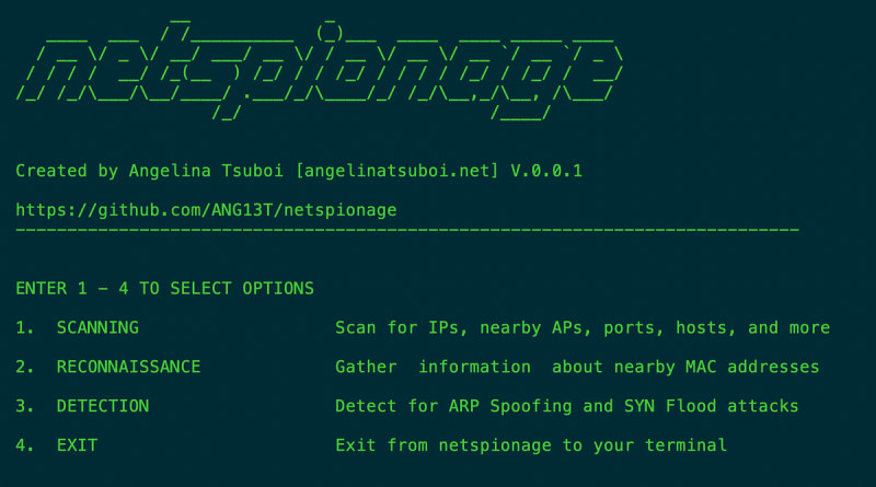netspionage is a CLI (command line interface) utility developed using Python for network forensics and network reconnaissance. It scans and monitors network activity, obtains information about devices connected to the network, and detects attacks targeting the network.