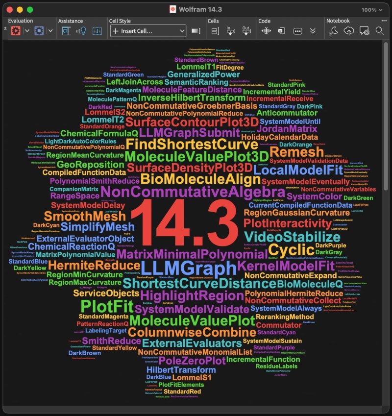 Wolfram Language & Mathematica version 14.3 introduces comprehensive dark mode support with automatic color switching algorithms, new agentic AI capabilities through LLMGraph for workflow automation, enhanced data fitting functions like ListFitPlot and LocalModelFit, improved map rendering with vector graphics, non-commutative