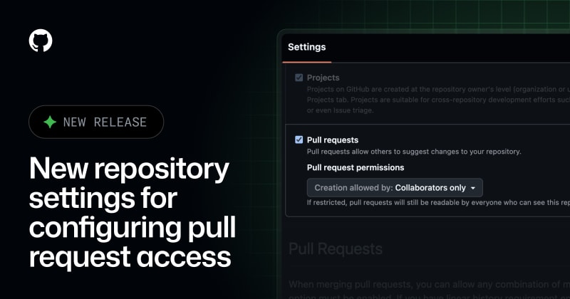 GitHub introduced two new repository settings for managing pull request access. Maintainers can now completely disable pull requests (hiding the tab and preventing all PR activity) or restrict PR creation to collaborators only while keeping existing PRs visible. These settings are available in repository Settings > General >
