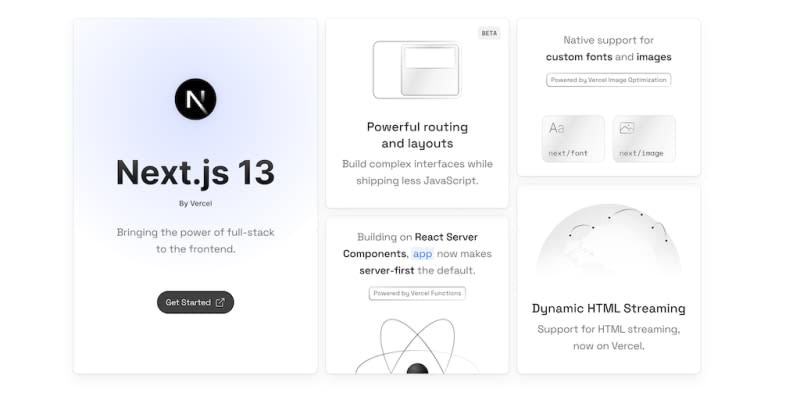 Next.js 13 includes nested layouts, server-side streaming, component-based data-fetching, and Turbopack – the Rust-based