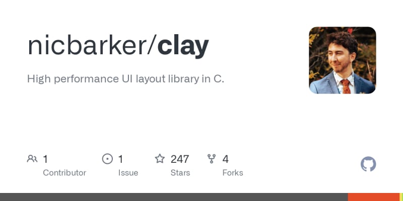 Clay, a high performance 2D UI layout library in C, offers microsecond layout performance and a flex-box like model. It features zero dependencies, Wasm support, static arena-based memory usage, and a renderer-agnostic output. The library can compile to a 15kb uncompressed .wasm file for browser use, and it supports nested