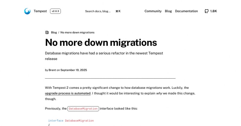 Tempest framework has refactored its database migration system, eliminating the need for down migrations. This change simplifies the migration workflow by removing the complexity of rollback functionality, focusing on forward-only database schema changes.