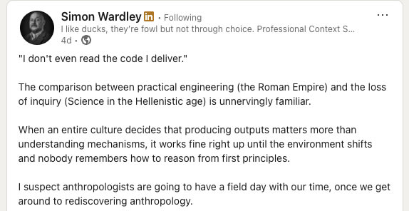Modern software systems have grown so complex that no single person can understand them completely, from hardware interrupts to application logic. This reality predates AI but is accelerating with LLM-assisted development. While frameworks that obscure underlying mechanisms ("magic") have always been controversial, the benefits
