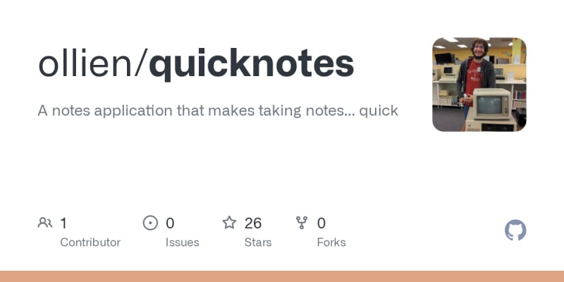 Quicknotes is a simple, fast note-taking application that stores notes locally in plain text. It can be installed via Cargo and allows users to create, edit, and maintain notes easily using their preferred text editor. Quicknotes also supports daily notes for journaling and offers customizable configuration. The app is designed