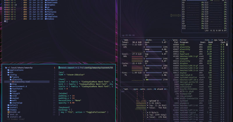DHH has released Omarchy, a pre-configured Arch Linux distribution with Hyprland tiling window manager designed for developers. This opinionated setup provides an out-of-the-box developer environment that complements his Ubuntu-based Omakub project. While Arch Linux itself isn't overly difficult, Hyprland requires extensive