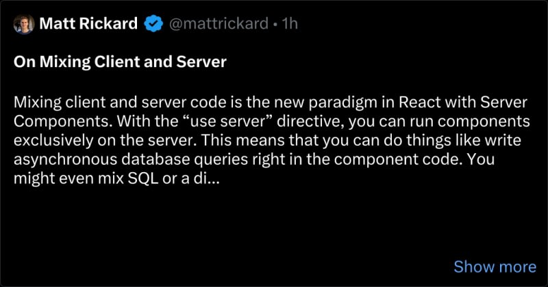 Mixing client and server code in React with Server Components allows for more performant web applications, colocated code for quicker iteration, and React Component as the new API. However, it can also cause confusion in determining whether a component is a client or server component, impact dependencies and code organization,
