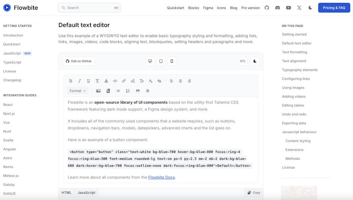 Flowbite's open-source WYSIWYG text editor, built on the Tip Tap library, utilizes Tailwind CSS for styling. It supports complex text formatting, dark mode, RTL styles, and responsive design. Users can easily integrate functionalities using JavaScript and Flowbite’s API. The post provides a detailed guide on installing