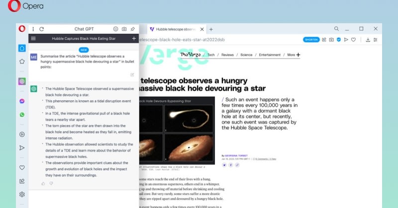 Opera is integrating ChatGPT into its sidebar to generate brief summaries of webpages and articles. The 'shorten' feature will provide bulleted summaries of the content. Opera plans to launch the feature in browsers soon and is also working on other AI-powered features for browsing.