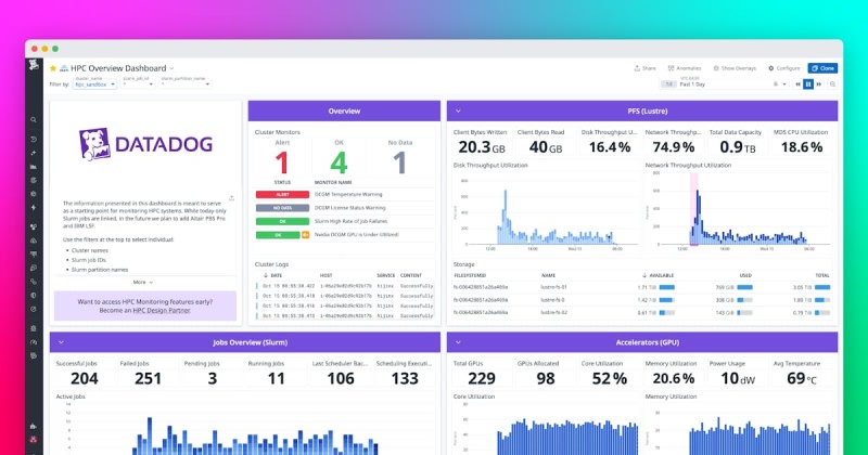 Datadog now provides comprehensive monitoring for high-performance computing environments, correlating job execution data from workload managers like Slurm with infrastructure metrics across compute, storage, network, and GPU resources. The platform supports on-premises, cloud, and hybrid HPC deployments, offering unified