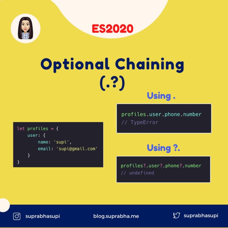 The optional chaining operator ( ?. ) permits reading the value of a property located deep within a chain of connected objects without having to expressly validate that each reference in the chain is valid. The ?. operator functions similarly to the . chaining. operator, except that instead of causing an error if a reference is