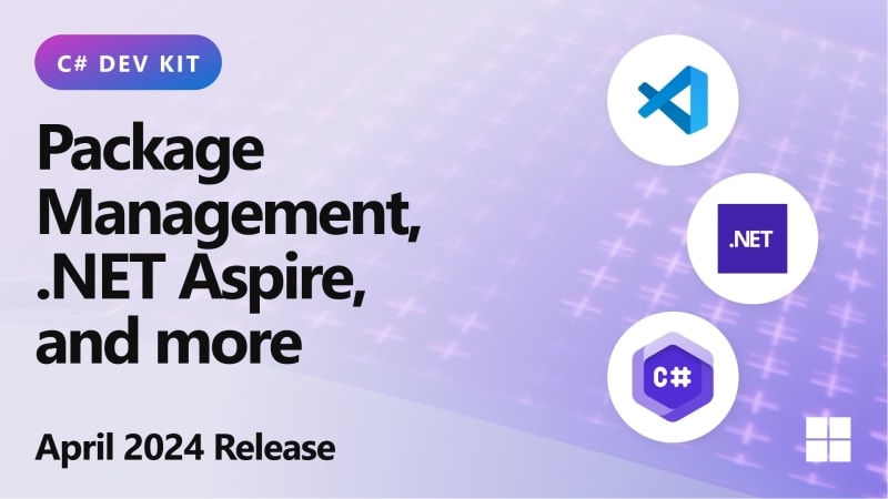 Announcement of the May release of C# Dev Kit, introducing package management for NuGet packages in Visual Studio Code and the ability to run/debug .NET Aspire applications. It also includes a new command to see the active document in Solution Explorer.