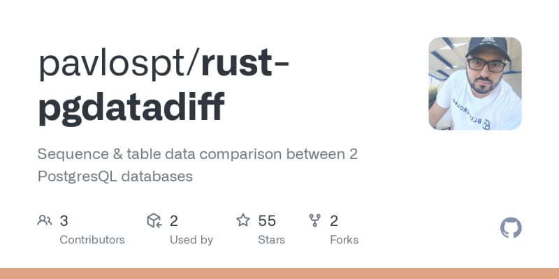 Rust PGDataDiffInstallation (Client)Installation (Library)Usage (Client)Usage (Library)ExamplesAuthorsSort: