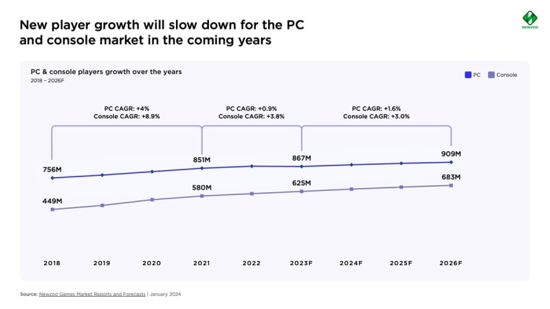 The PC and console market grew by 2.6% in 2023, but playtime hours decreased. The report highlights the challenges in the market, the decrease in average quarterly playtime, and the dominance of franchise games. It also mentions the growth opportunities in emerging markets.