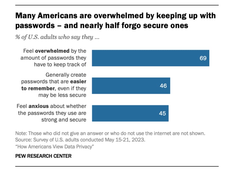 The Pew Research Center report highlights Americans' growing concerns about data privacy, including government handling of personal data and corporate use of artificial intelligence. It also discusses the burden of password management and the risks of password reuse. The report reveals that many Americans have experienced data