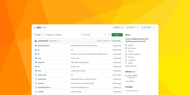 Phiki, developed by Ryan Chandler, is a PHP-based syntax highlighter that uses TextMate grammar files and Visual Studio Code themes to generate syntax-highlighted code for web and terminal. It supports over 200 language grammars, more than 50 themes, and features line numbers and multi-theme support. Phiki integrates easily with CommonMark for blogs and documentation sites.