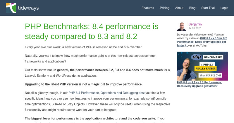 Tideways conducted tests comparing PHP versions 8.2, 8.3, and 8.4. The results indicate steady performance across these versions for Laravel, Symfony, and WordPress demo applications.