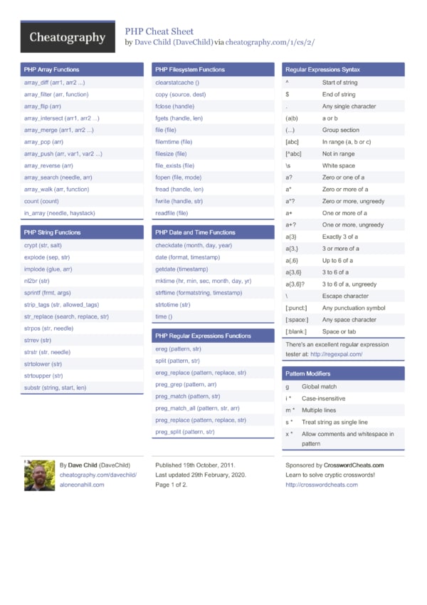 A quick reference guide for PHP, featuring functions references, regular expression syntax guide, and date formatting functions. Now includes popup links to the relevant PHP manual pages for easy access to detailed information.