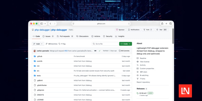 PHP Debugger is a new PHP extension forked from Xdebug that strips out everything except step debugging — no profiler, no code coverage, no tracing. Benchmarks show dramatically lower overhead when loaded but idle: up to 97% less than Xdebug (e.g., +12.9% vs +661.6% on a synthetic benchmark). It works as a drop-in replacement,