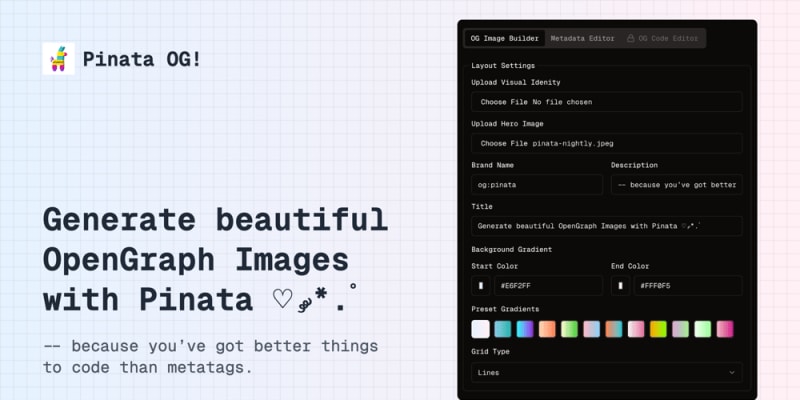 Pinata OG is a platform that enables users to create captivating OpenGraph (OG) images with ease. This tool simplifies generating OG images and the necessary metadata tags for social media sharing. By using technologies like Pinata File API, Supabase, Shadcn/ui, and NextJS, users can quickly produce unique, optimized images