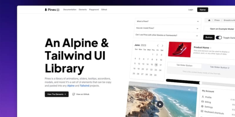 Pines is a library of animations, sliders, tooltips, accordions, modals, and more! It's a set of UI elements that can be copy and pasted into any Alpine and Tailwind projects. This is Pines's first launch.