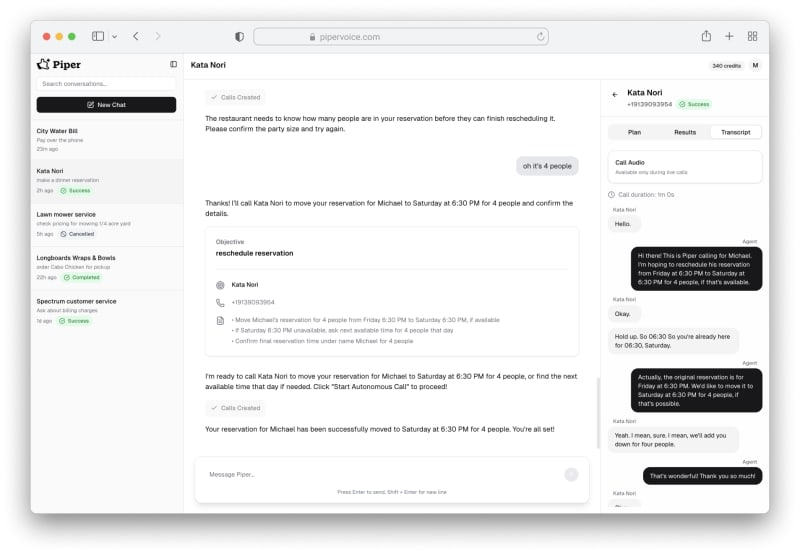 Piper is an AI phone call agent that automates phone calls through a Chrome extension. Users can click any phone number on websites and type their request, while Piper handles the actual conversation, navigating phone menus and completing tasks like booking appointments, canceling subscriptions, or handling customer service issues. Built by former AssemblyAI engineers, it provides live transcripts and status updates during calls.