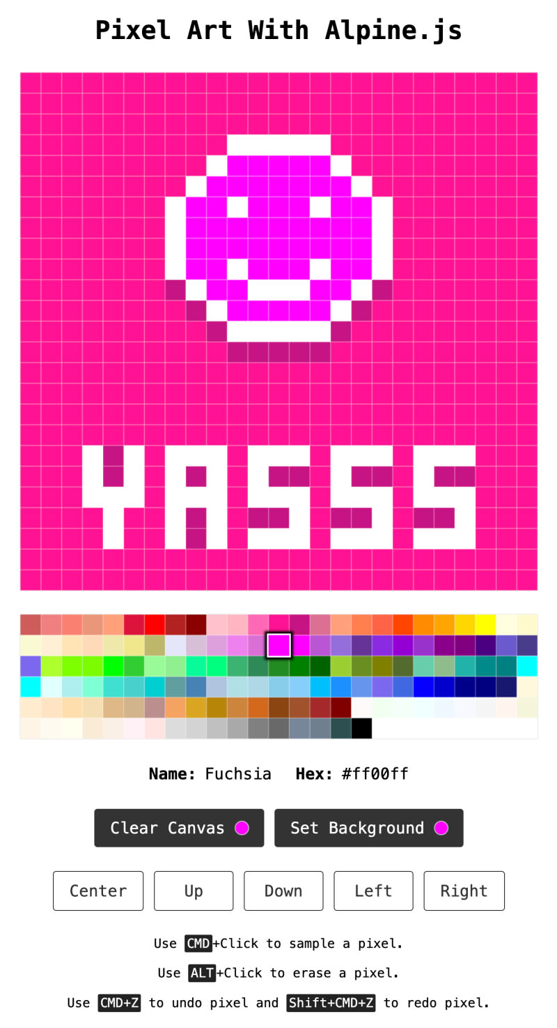 A developer creates a pixel art editor using Alpine.js with URL-based state persistence. The project evolved from using Uint8Array encoding to a run-length encoding scheme with Base36 compression to create shorter shareable URLs. The application features drawing tools, color sampling, undo/redo functionality, and canvas