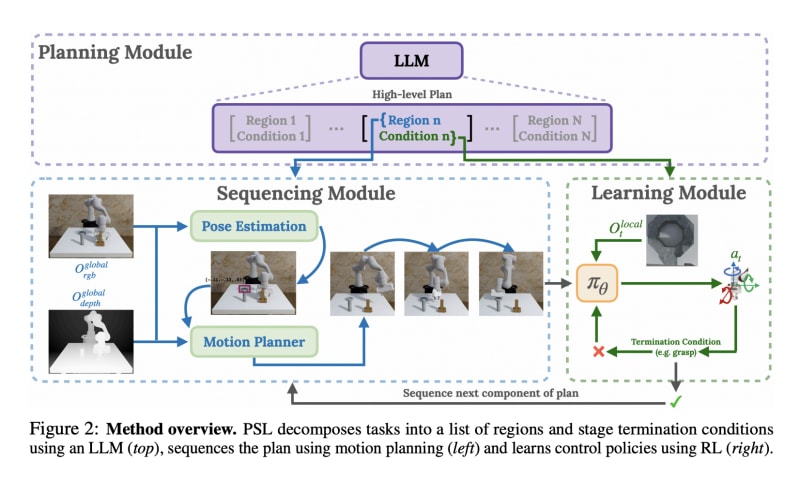 A modular solution called PSL integrates language models with reinforcement learning for robotic tasks, achieving a success rate above 85% and outperforming existing methods in contact-rich tasks.