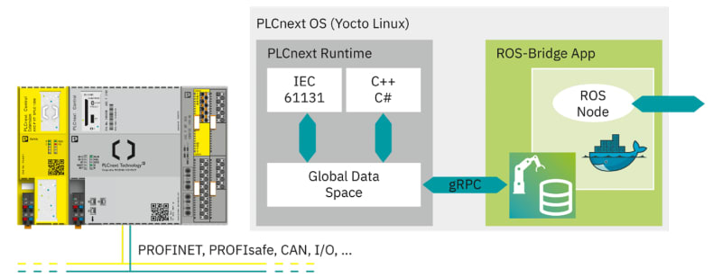 The PLCnext ROS Bridge is an open-source integration layer that connects Phoenix Contact PLCnext industrial PLCs to ROS-based robotic systems. It runs as a Docker-packaged PLCnext App and provides bidirectional communication between the PLC's Global Data Space (GDS) and ROS topics via gRPC. A code-generation workflow driven by